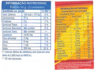 Carboidratos; Proteínas; Gorduras Totais; Gorduras Saturadas; Gorduras poli-insaturadas; Gorduras monoinsaturadas;Gorduras hidrogenadas; gorduras trans; Colesterol; Fibra Alimentar; Sódio e outros: cada um desses nutrientes tem expresso ao lado suas quantidades contidas na porção declarada e em outra coluna, o percentual equivalente ao valor diário de uma dieta de 2000 kcal.